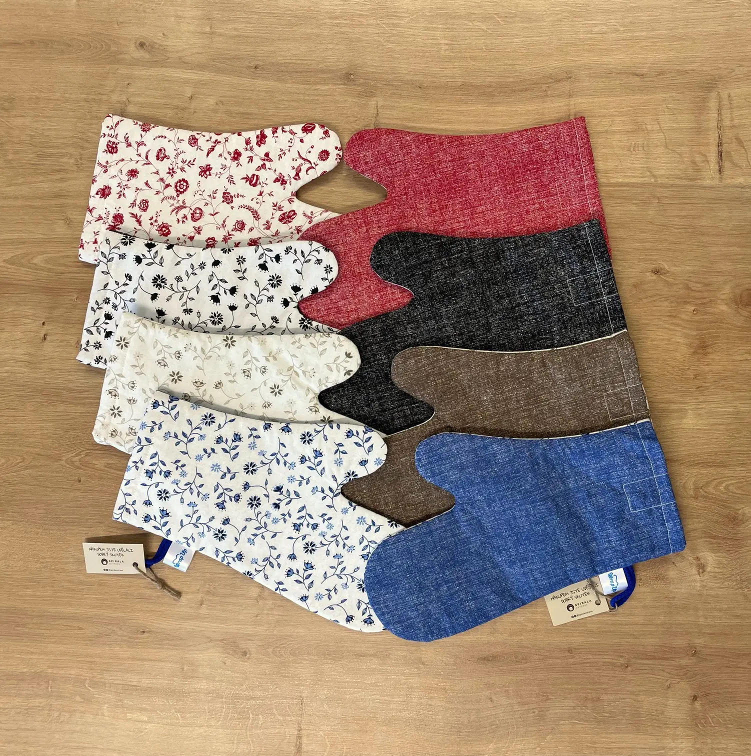 Žltý geometrický so žltou, Hnedé kvetiny s hnedou, Modré kvetiny s modrou, Čierne kvetiny s čiernou, Červené kvetiny s červenou, Geometria s čiernou, Levanduĺa na bielej s fialovou, Ražný prírodný natural, Mäta s petrolejom, Šedý s ornamentom, Šedý so srdiečkami, Frýdecký vzor, Levanduľa na ražnej, Ražný s červenými bodkami, Zelený s bodkami, Labky, Modrý, Ražný s bielymi bodkami