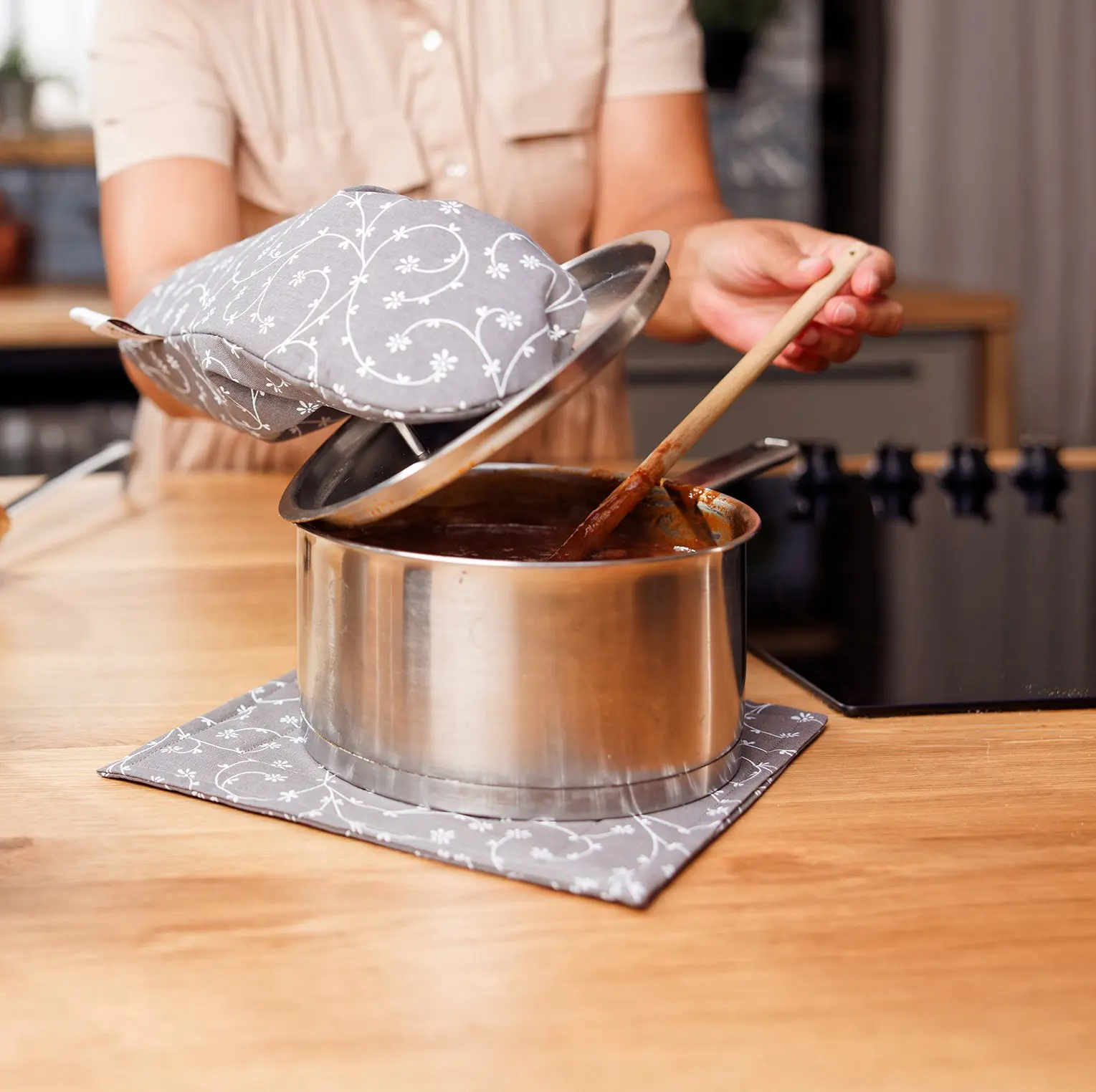 Štýlová termo podložka pod hrniec alebo kanvicu chráni váš nábytok pred poškodením a dokonale zútulní váš domov. Termo podložku s obojstrannou tepelnou výplňou môžete bezpečne použiť priamo pod horúci hrniec namiesto dosky na krájanie alebo ako dekoráciu stola v mnohých dizajnoch.