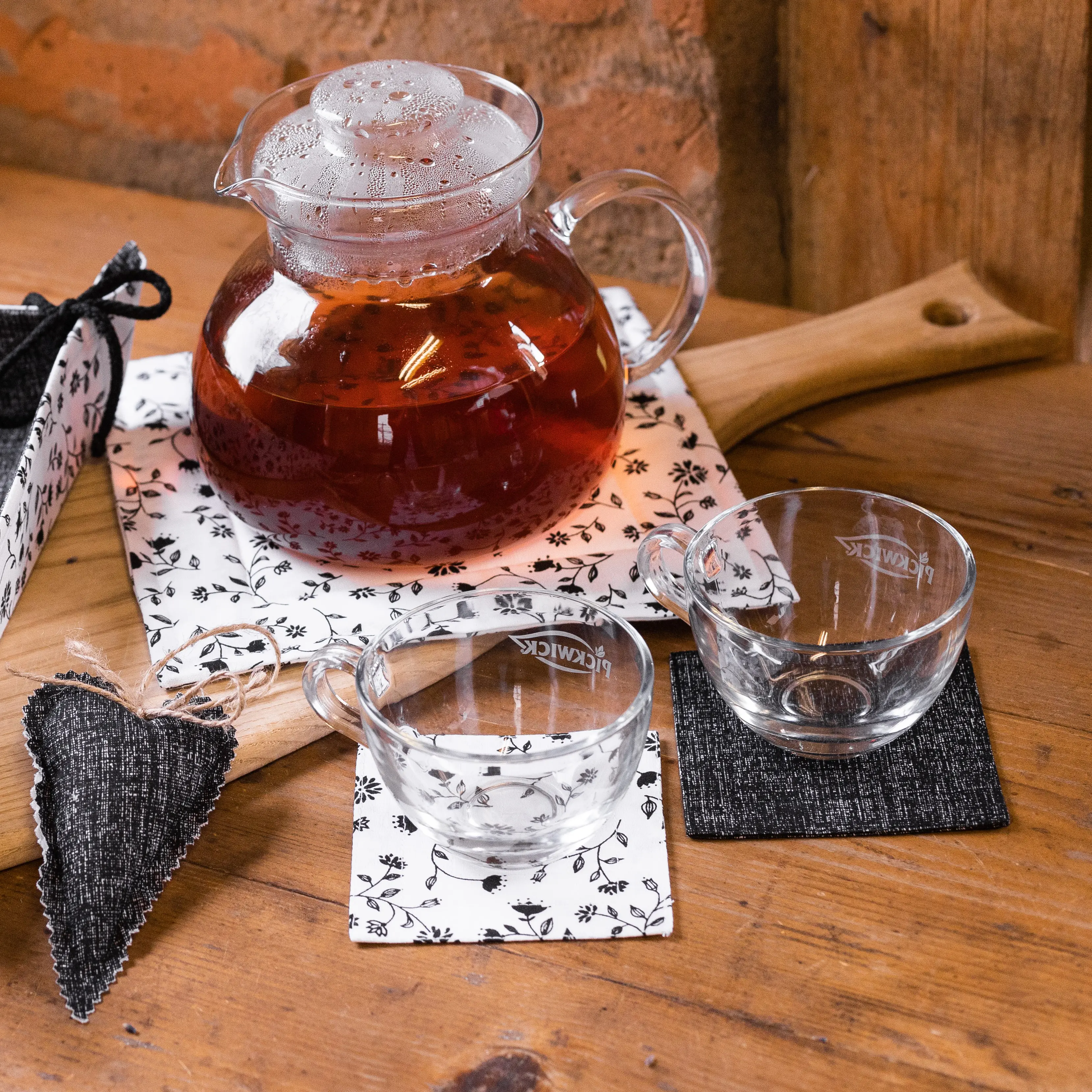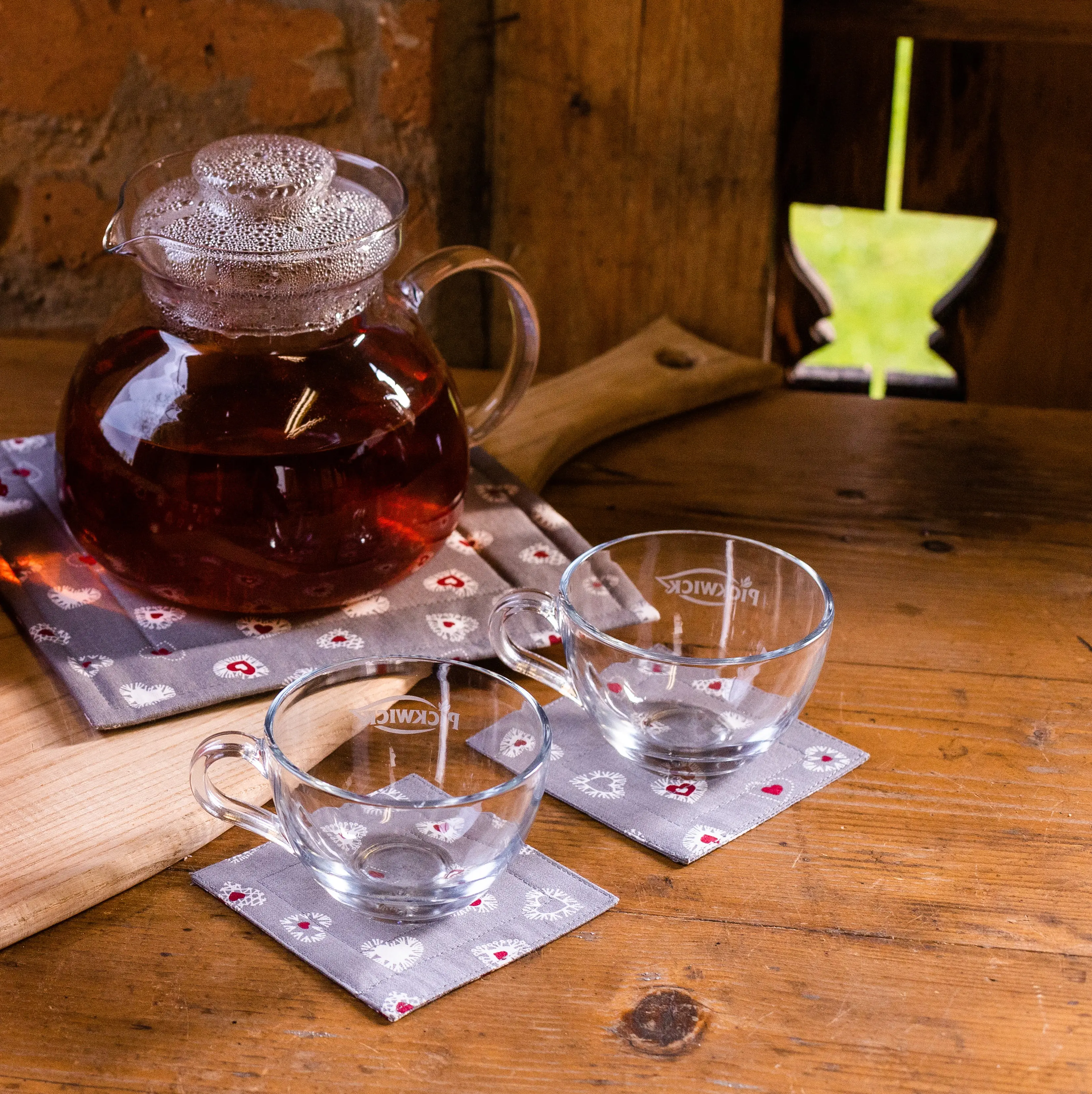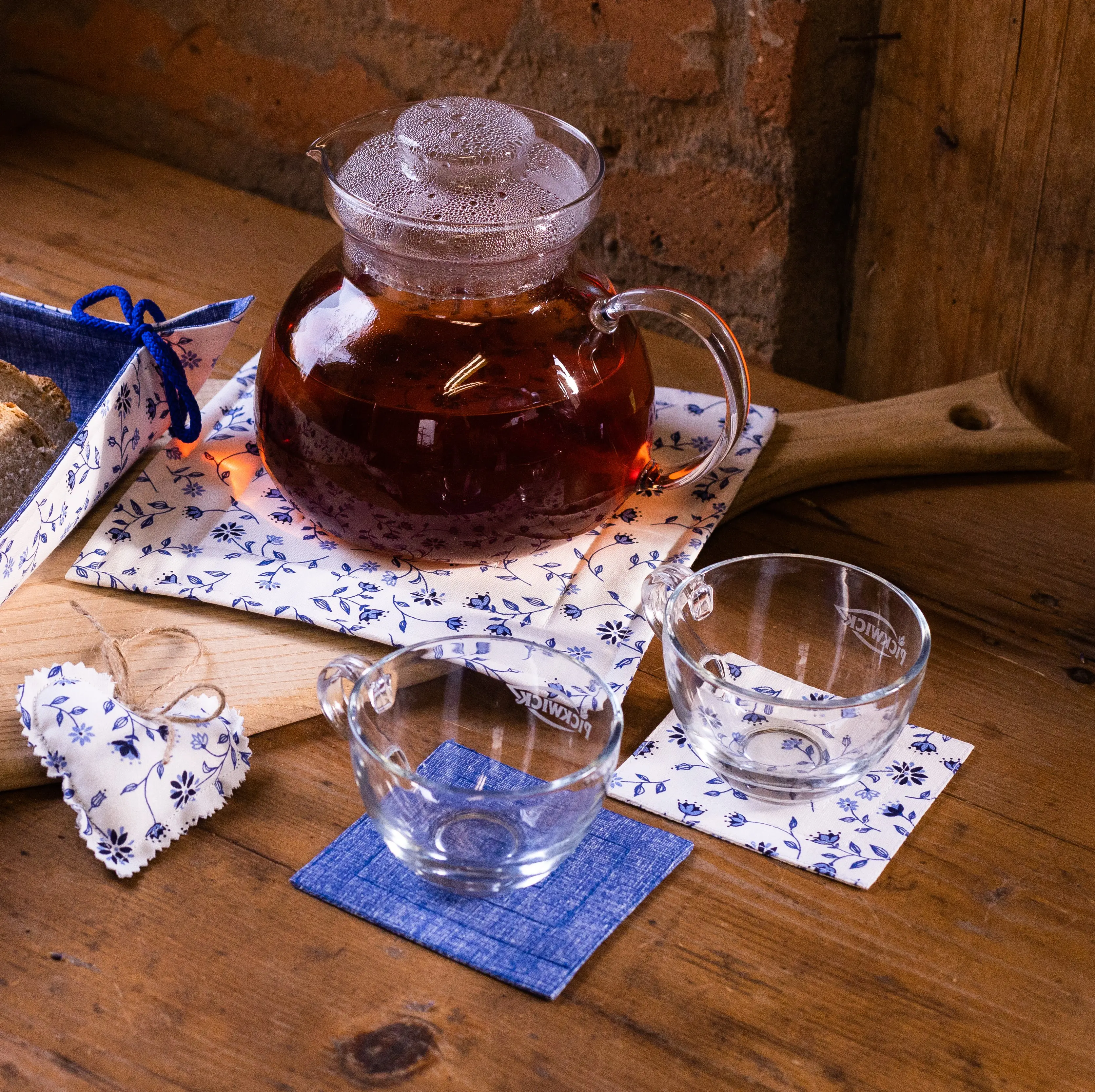 Termopodložky pod hrnce, podšálky a chňapky – ručné pranie do 40 stupňov, ale dôležité je jemné žmýkanie, aby sa nepoškodila výplňová tkanina. Výrobky perte oddelene v jemnom pracom prostriedku. Všetky možno žehliť z oboch strán, len pozor, že chňapka má všitý magnet.